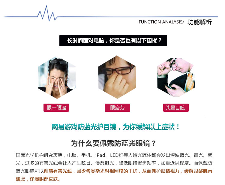 防蓝光,防辐射,佩戴后视界更清晰柔和,有效缓解眼干眼涩眼疲劳,让你玩游戏更过瘾,战斗力更持久!