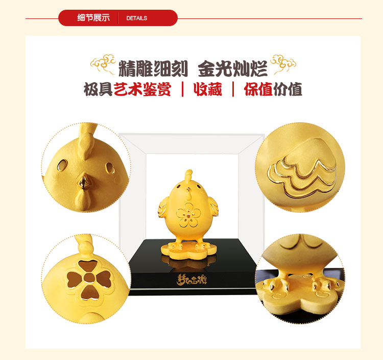 纯铜内胚,表面精铸千足纯金,质感细腻,金光灿灿,鸡年收藏送礼佳品