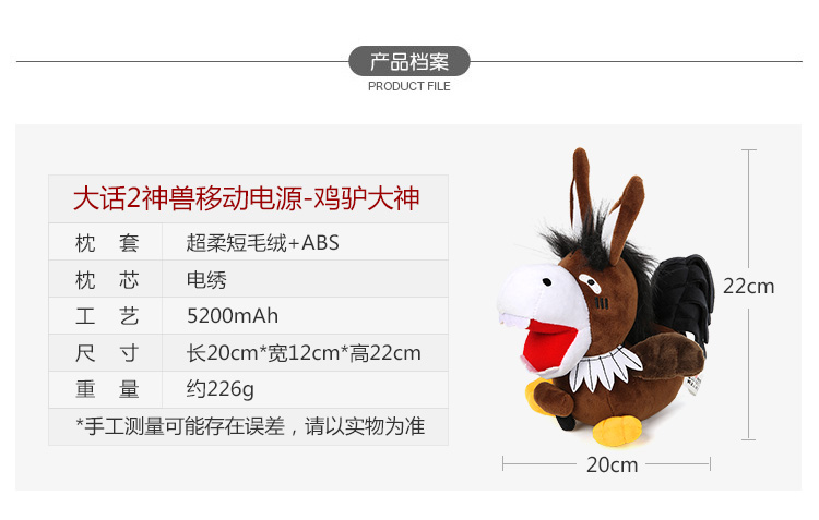 5200mAh容量,2A高速电流输出,充电就是快,既是移动电源,也可当公仔挂机,便携实用,驴头鸡身造型,生动独特,喜感十足